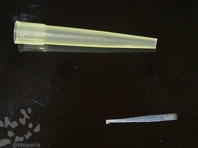 - 適当な柄。ここでは100μLピペットチップを使用。竹の丸箸とかも使えると思うがその場合は接着剤にはepoxy adhesiveが良い。