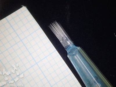 小箱の上に載せて先端を輪ゴムで止め、ピンセットなどで形を整える。 ブラシの先端3〜4mmぐらいから後にUVレジンを少量盛る。 UVレジンはいったん、クッキングシート等に出して、つまようじの先端で少量取って塗る。 多く塗ると毛細管減少で先端まで固まってしまうので注意。